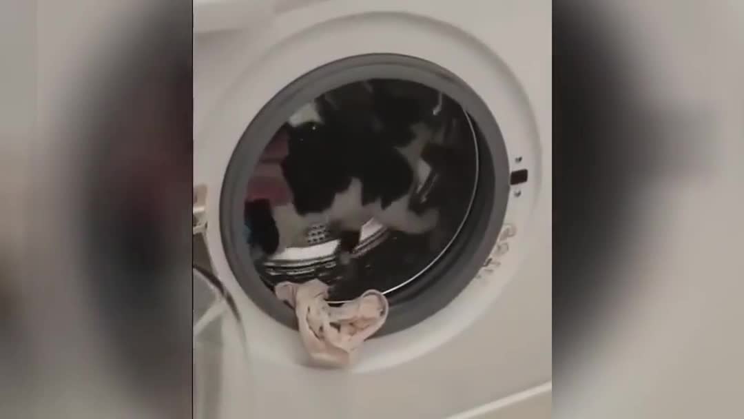 «Не мешай, я бегаю»: кот решил устроить пробежку в стиральной машине