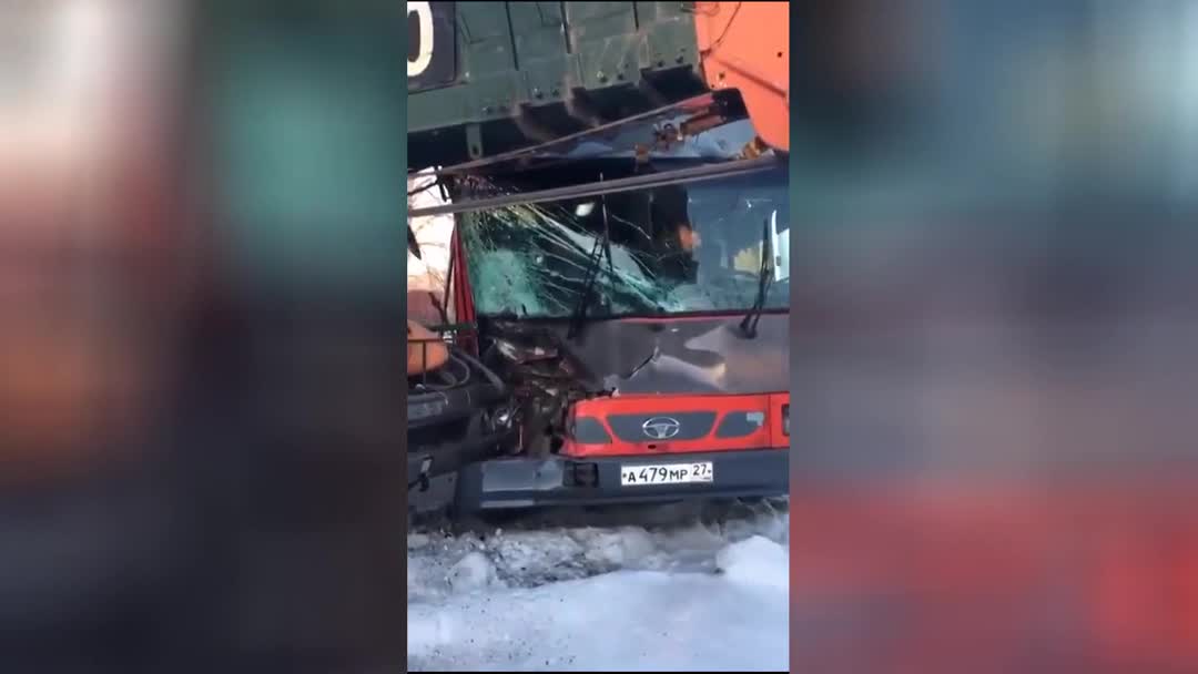 Автокран протаранил пассажирский автобус в Хабаровске