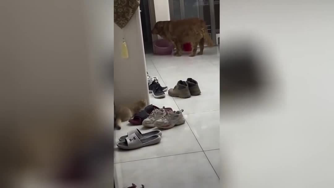 «Сюрприз!»: котёнок хотел напугать пса, но что-то пошло не так